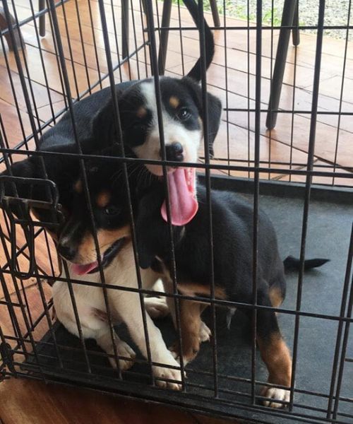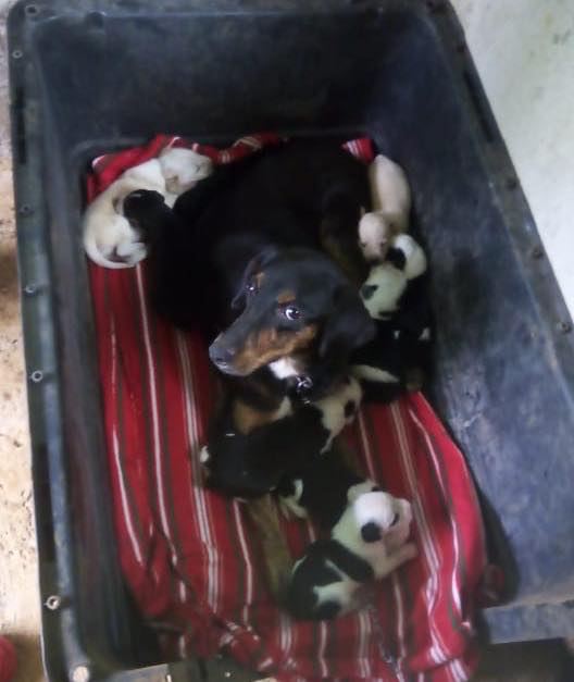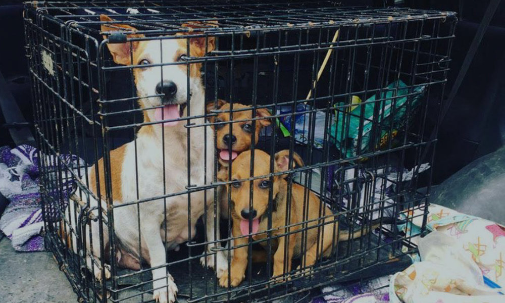 This litter was dumped in a crate by a bridge (see first pic). We responded immediately, knowing the pups were in danger as they were dumped between a road and a large river. All were vaccinated and spayed/neutered in the weeks we had them. They were all adopted.